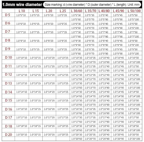 Afmetingen: buitendiameter draad (1,0 mm), diameter (10-30 mm), lengte (10-50 mm).
